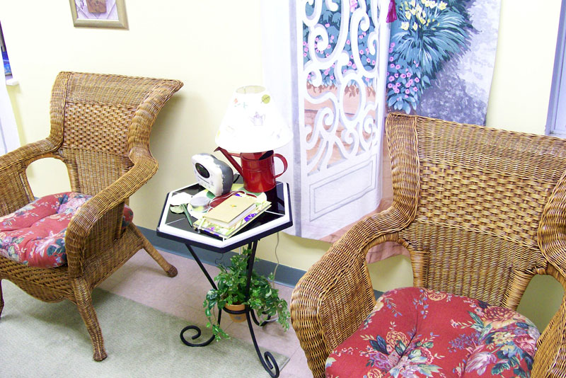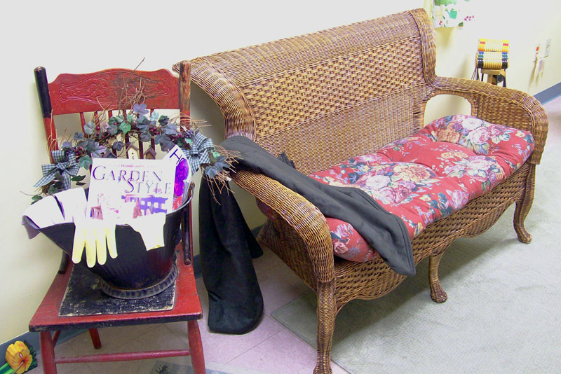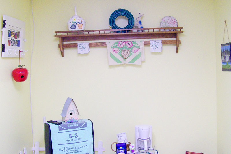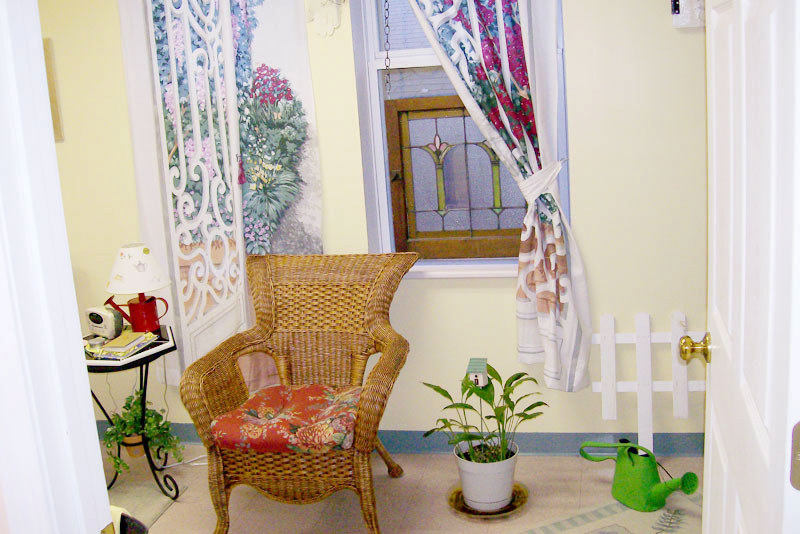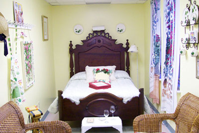 THE GARDEN ROOM - The Garden room is our smallest and coziest room and is decorated in garden decor. The room features a mini refrigerator, coffeemaker, and a private bath across the hall, as well as the the lovely stained glass and antiques that grace all of our rooms. |